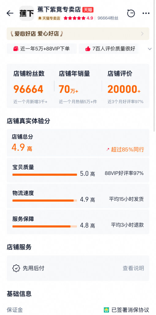 長く運営されている店舗(目安として1年以上)は、それだけ安定している証拠と言えます。 - 金牌卖家(ゴールドメダルセラー):