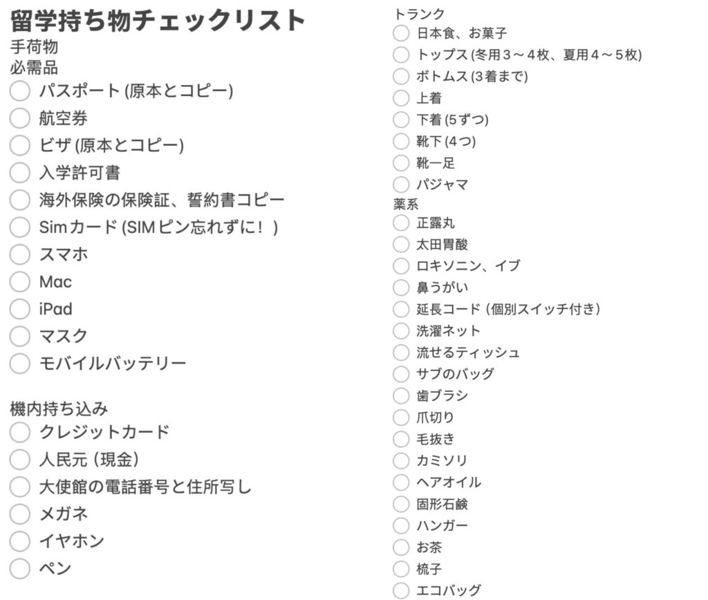 【中国留学の持ち物】これだけでOK!現役留学生が作った持ち物チェックリスト